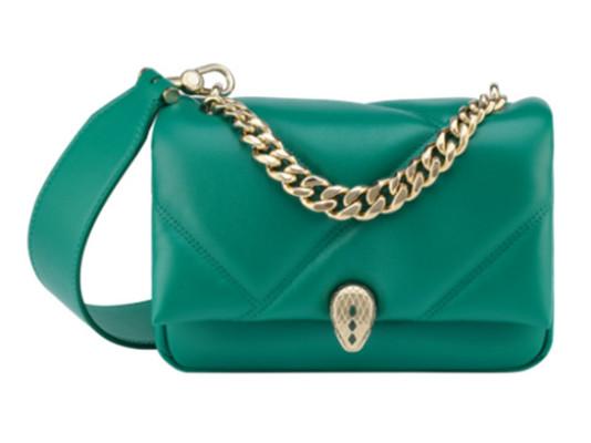 宝格丽SERPENTI ELLIPSE系列小号斜挎包定价16500元,包身采用鲜绿色都市粒纹小牛皮材质,搭配镶嵌宝石的经典蛇首磁扣,灵感源自1960年代的一枚BULGARI宝格丽腕表。包包配有链条和皮革肩带及皮革手柄,顶部拉链开合,一个内部口袋,一个背面外置口袋。