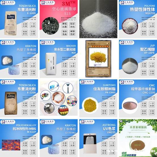 苯乙烯嵌段共聚物SEBS/SEPS、光稳定剂、抗氧化剂、气相/沉淀/凝胶法二氧化硅、抗静电剂、亚磷酸酯、空心/实心玻璃微珠、色浆/色片/色母、塑料微球、有机颜料、有机过氧化物、EBS/PETS、骨炭黑、木质素磺酸盐、绒毛粉、硅微粉、煅烧高岭土、钛白粉、松香/酚醛/石油树脂、SMA树脂、抗冲改性剂MBS、阻燃剂、消泡剂/硅烷偶联剂/有机硅手感剂/有机硅树脂粉末、消光/哑光粉、防霉/防菌/防藻剂、开口剂、聚乙烯醇、羧酸乙烯酯、硅溶胶、石英粉、PTFE微粉、脱模剂、清洗剂、特种聚苯醚PPO、防指纹涂料原料、快干耐黄变固化剂/自我恢复型固化剂/水分散型固化剂、TDI/MDI/HDI、纤维素醚、分散剂/流变助剂/润湿剂、PE隔板/酚醛树脂隔板、锂电如:羧甲基纤维素醚/丁苯橡胶乳液/铝塑膜/涂碳铝箔/铜箔/碳纳米管/超导炭黑等世界知名公司的高性能精细化学品。